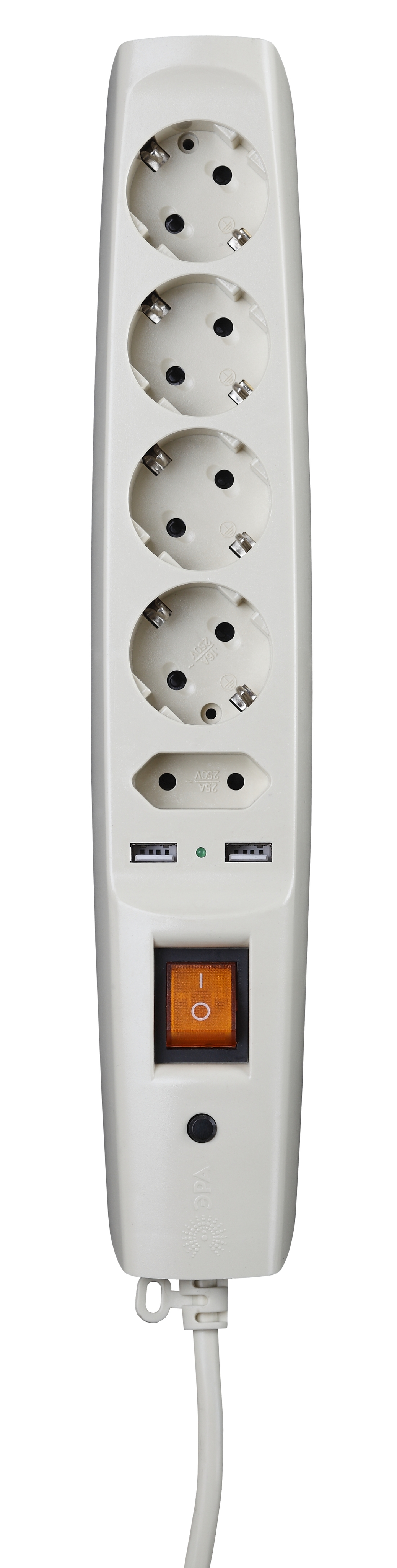 Сетевой фильтр используется как удлинитель (длина провода составляет 2м). Сетевой фильтр имеет 5 розеток: 4 стандартных гнезда и одно для зарядных устройств. На корпусе также расположены 2 USB-порта напряжением 2.1 А, что дает возможность быстрой зарядки мобильных устройств.